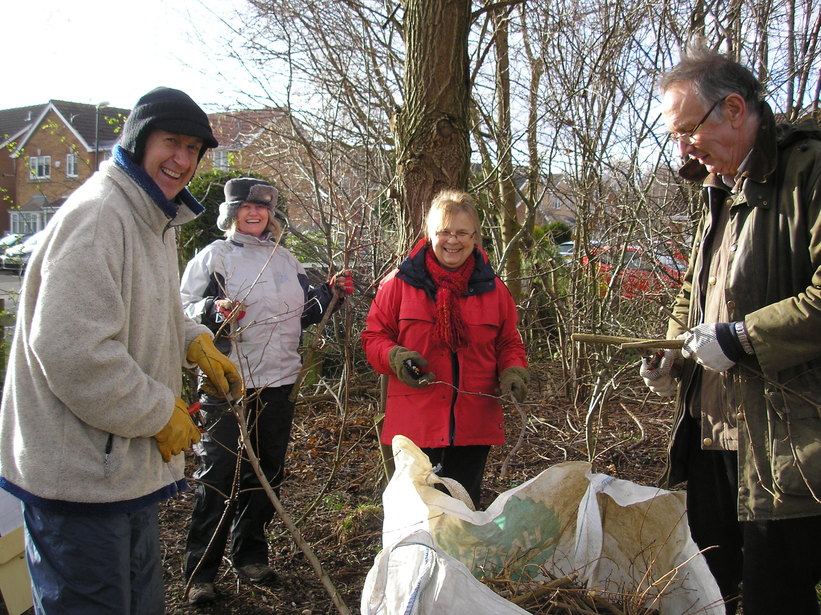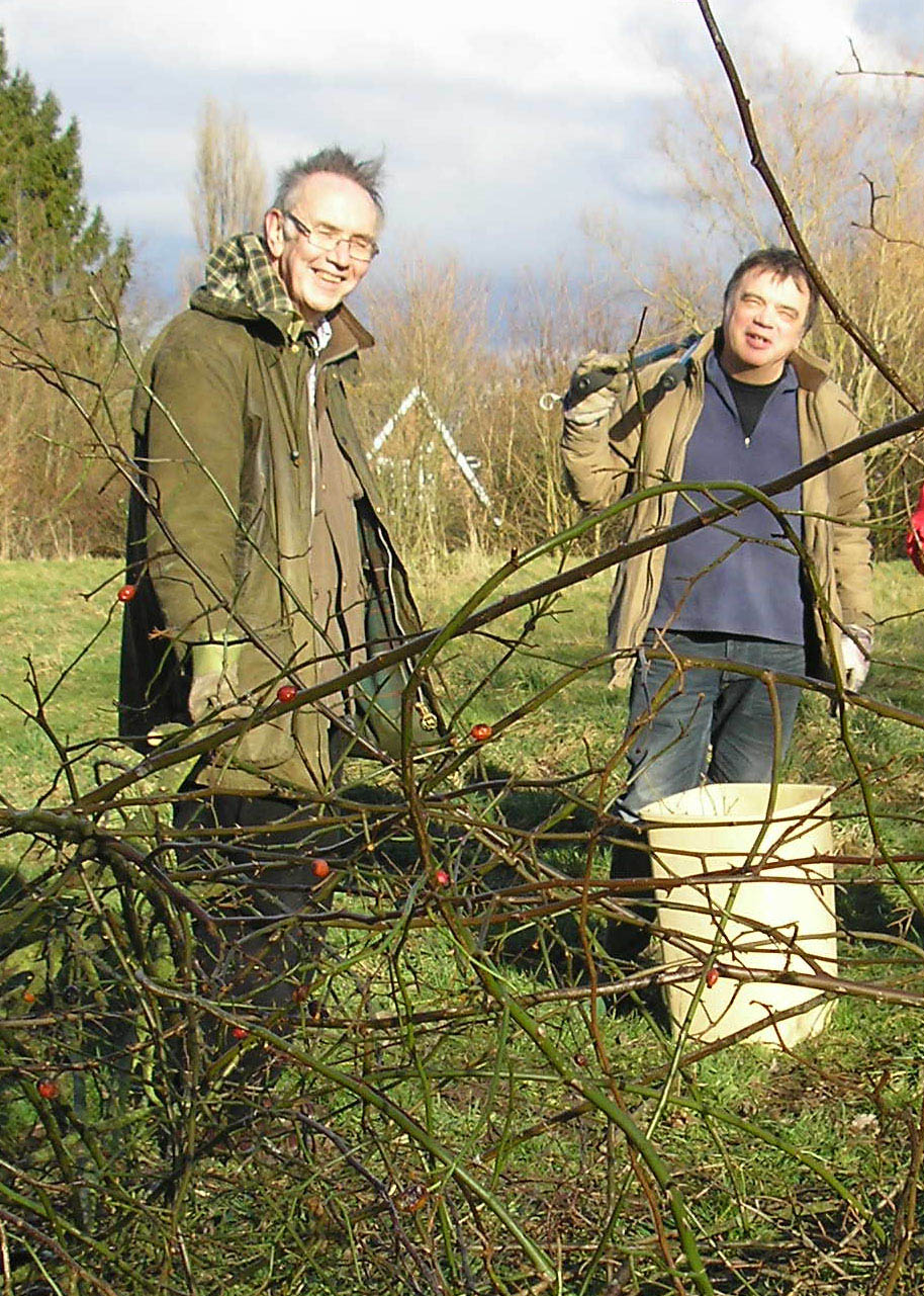 We were blessed with sunshine during our regular third-Thursday-of-the-month volunteer day on 20th February and made good progress with pruning back the overgrown roses beside the gate to reveal 3 nice holly trees and a small wild honeysuckle. There are already signs of vigorous new growth from young rose plants around the edge of that area. Paul Abbott (right below, caught on camera by Pam Brown) was a welcome addition to our volunteer team.