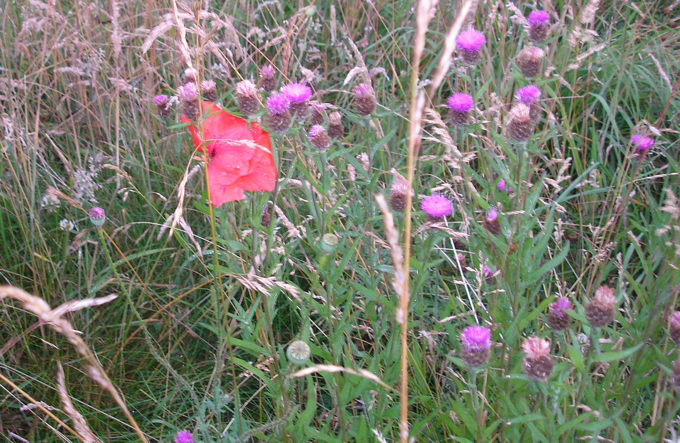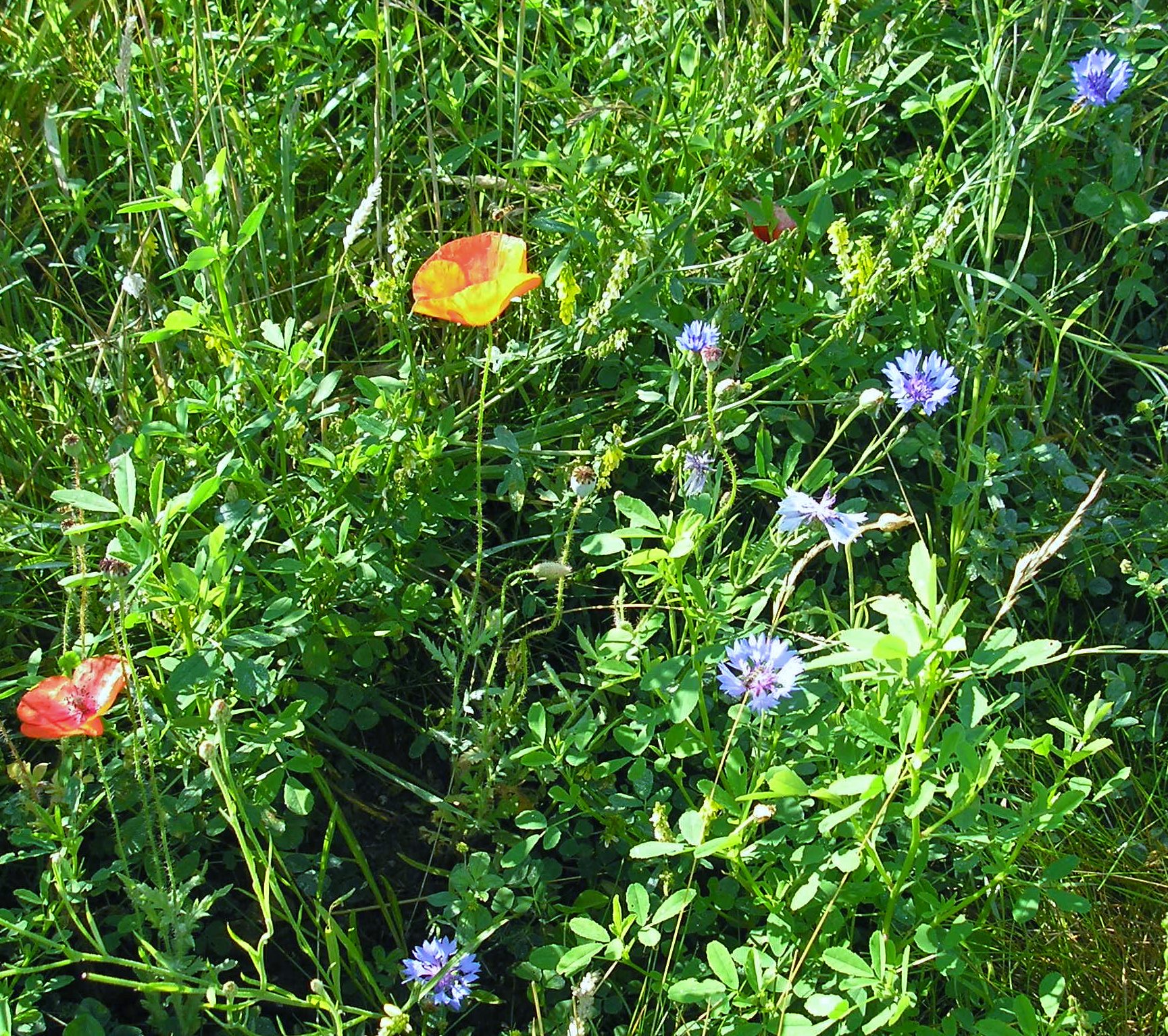 We were pleased to see a few patches of poppies and cornflowers emerging towards the end of July, as in Pam’s photo below, in spite of the heavy local competition on the wild flower meadow. We’ll try again next year when competition should be reduced from tall grasses as more grass (and the nitrogen it contains!) will have been removed.