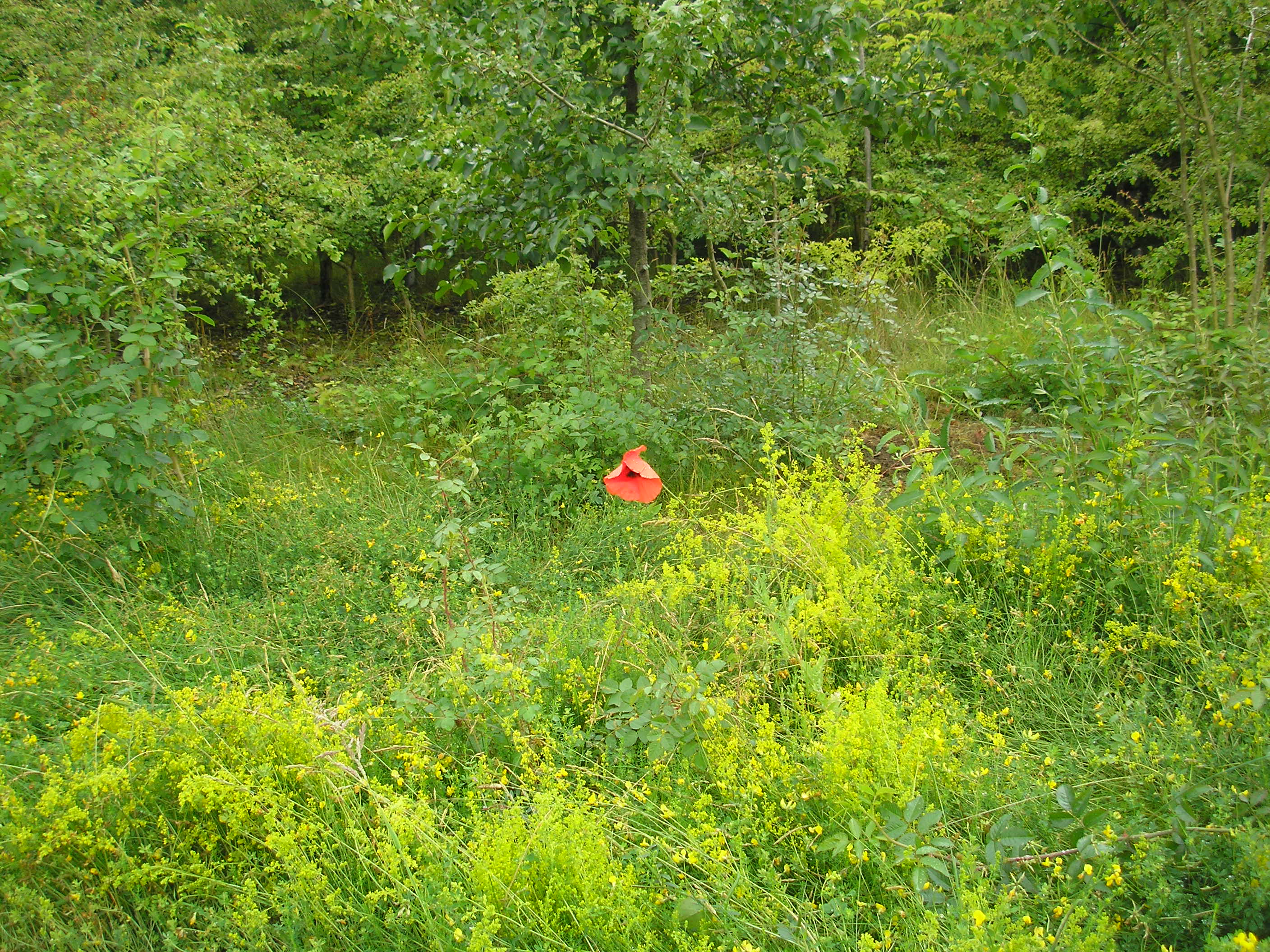 Red campion (top), Scabious (above left) and solitary Poppy surrounded by the yellow Lady’s bedstraw (above right) beside Nelsons Lane. Nature did its best to provide a big splash of yellow for le Grand Depart with all the regenerated bird’s-foot trefoil and Lady’s bedstraw alongside the fence!