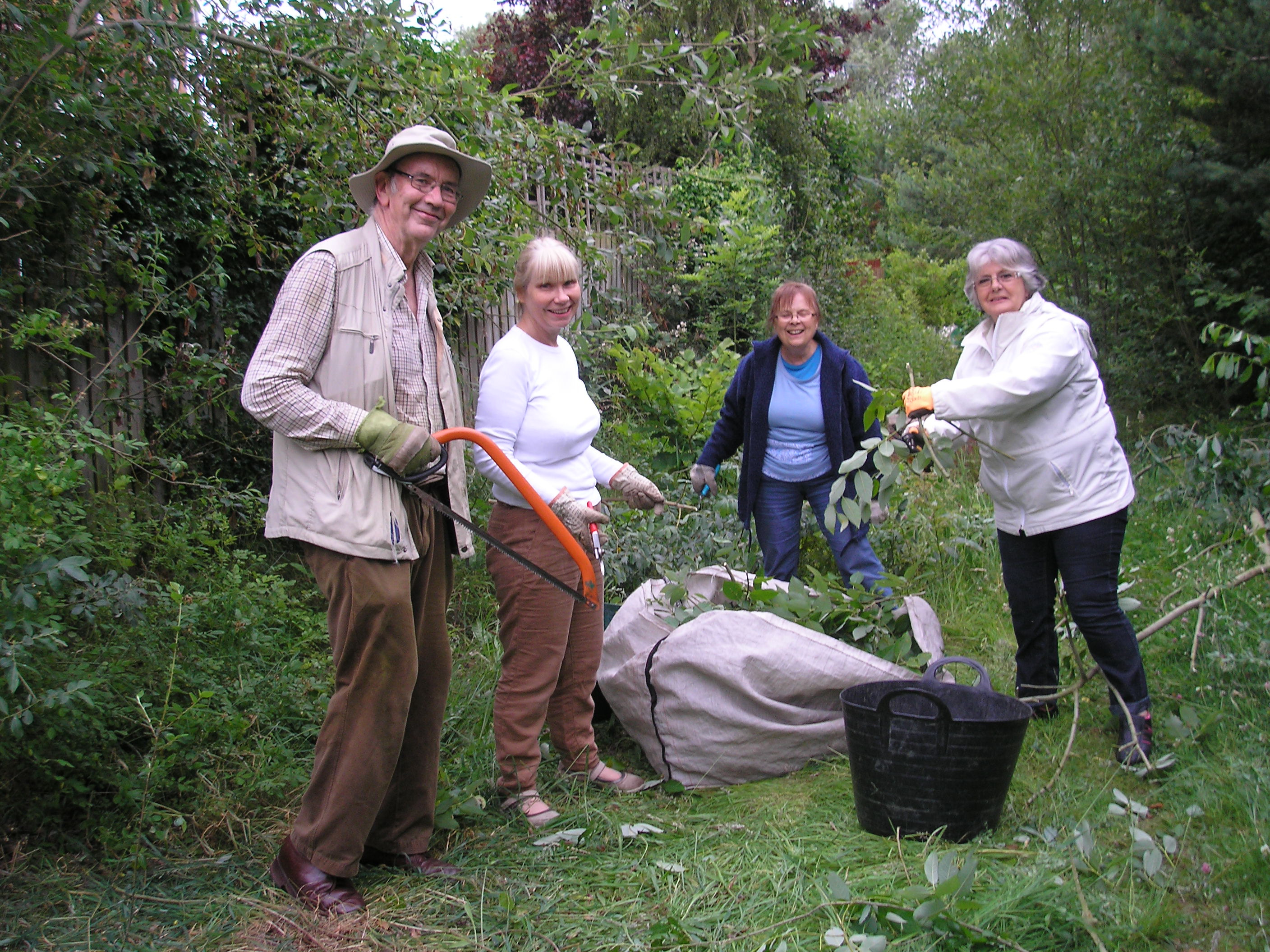 From 2nd July we started having a “Volunteer Hour” every Wednesday evening, starting at 7 o’clock. Thanks to Pam for the photos below of the first session, which was spent cutting down self-sown willows growing too close to a back fence at Goodwood Grove, and cutting up the pruned material for composting.