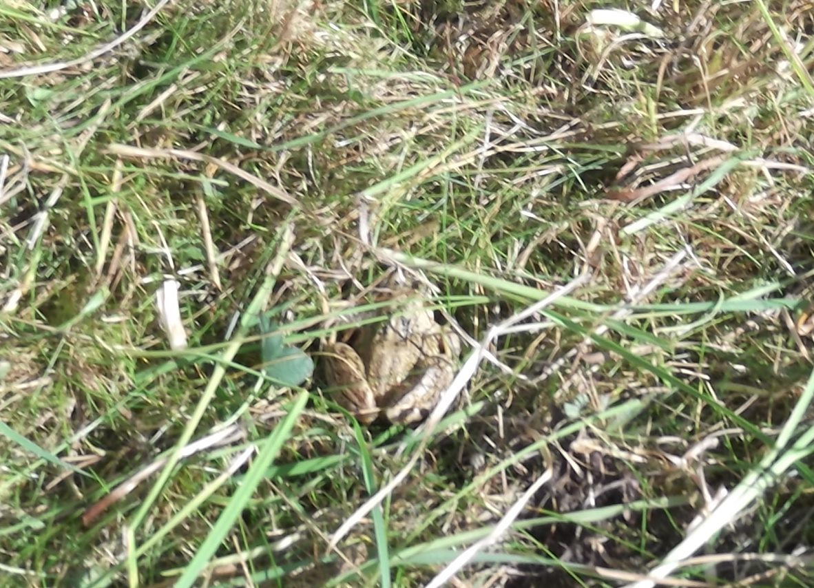 MCT always does its best not to damage any wildlife on the Mayfields site during its management operations. Sadly, recently a hedgehog was badly wounded by a dog bite and eventually died despite our best efforts. This is a real risk when dogs are out late in the evening when the hedgehogs are most likely to be out looking for food. Frogs and toads are well camouflaged as the photo below left shows. Even in the selective enlargement on the right below care is needed to spot the creature, which is why you will often see us on our knees trimming long grass carefully with hand sheers.