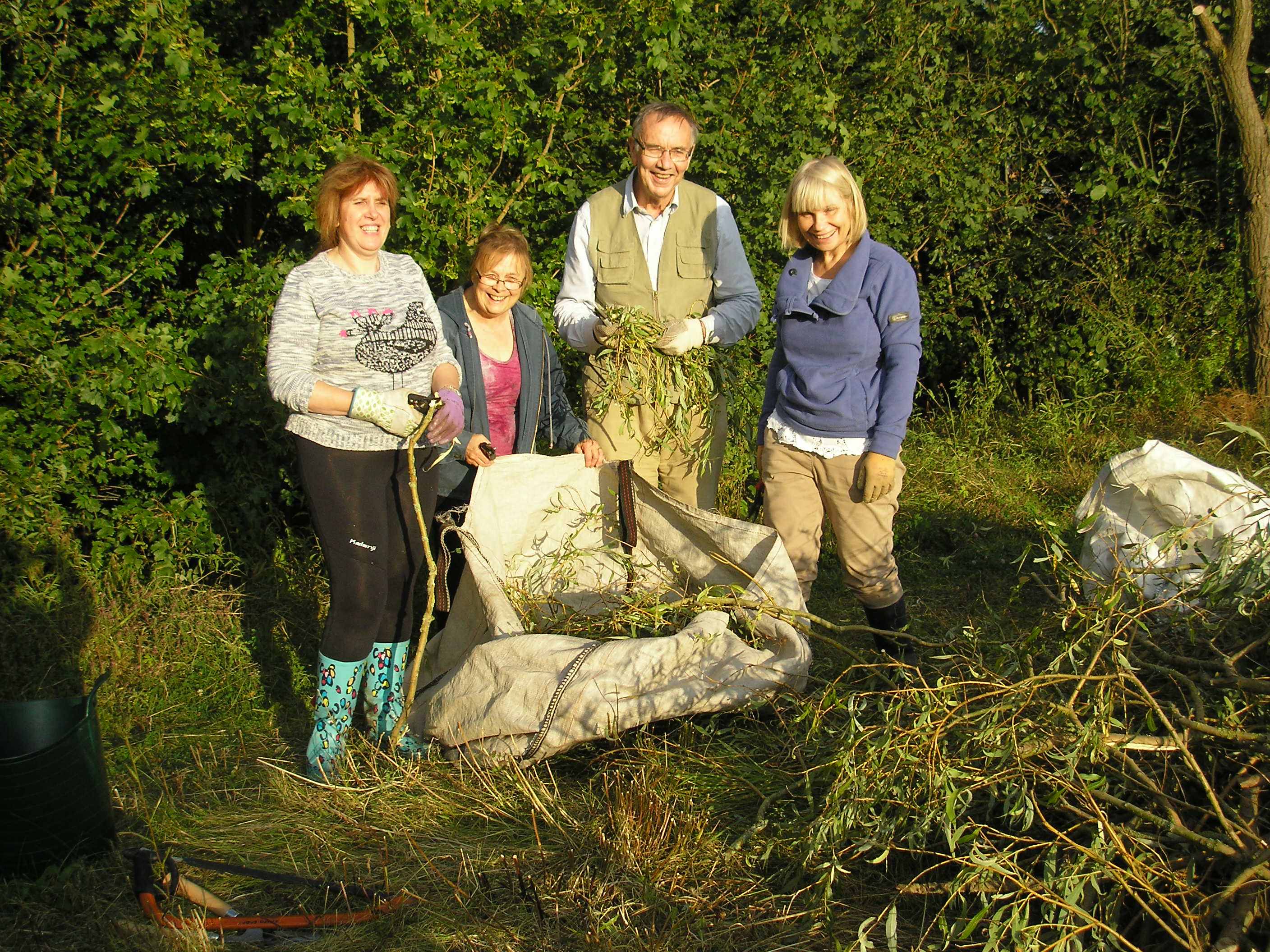 Our 7 volunteers (4 shown in photo below) enjoyed the evening sun while trimming the partially dead crack willow east of the wild flower meadow at the 2nd of our August Wednesday evening volunteer sessions. Note that there will not be a session on Wednesday 20th August as the co-ordinator/safety officer is away, so the next session will be on Wednesday 27th August, 2014.
