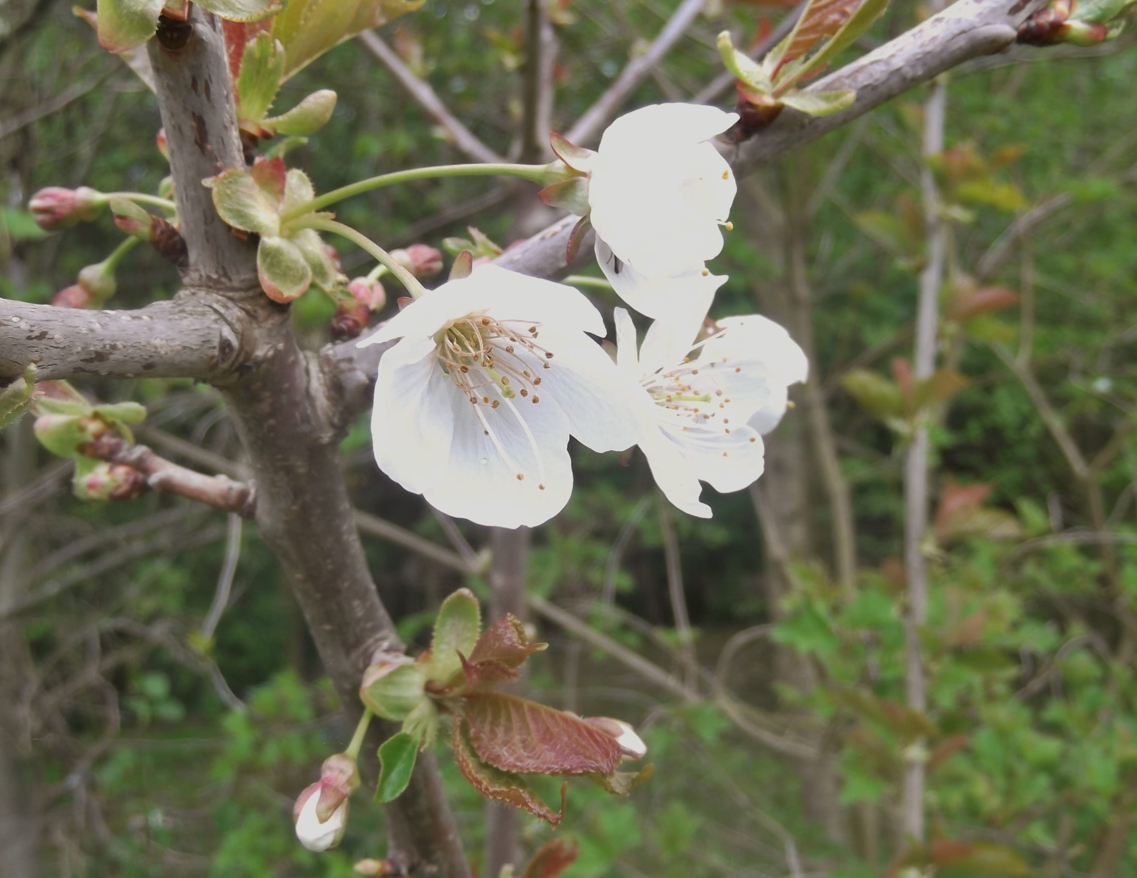 The cherries have almost finished flowering now, but you might catch some blossom at the N end of the west bund (as on the left below).  There are a few cherry tree saplings there that were hidden under the brambles that MCT has now trimmed back to safely pollard a crack willow; we suspect they are from cherry stones deposited by a passing human a few years back.  Dave Moore and Malcolm   spotted a young apple tree in flower on the W bund last Thursday, almost certainly from a pip in a discarded apple core. DSCF1170  Jack under the Hedghe Garlic Mustard May 1st 2015