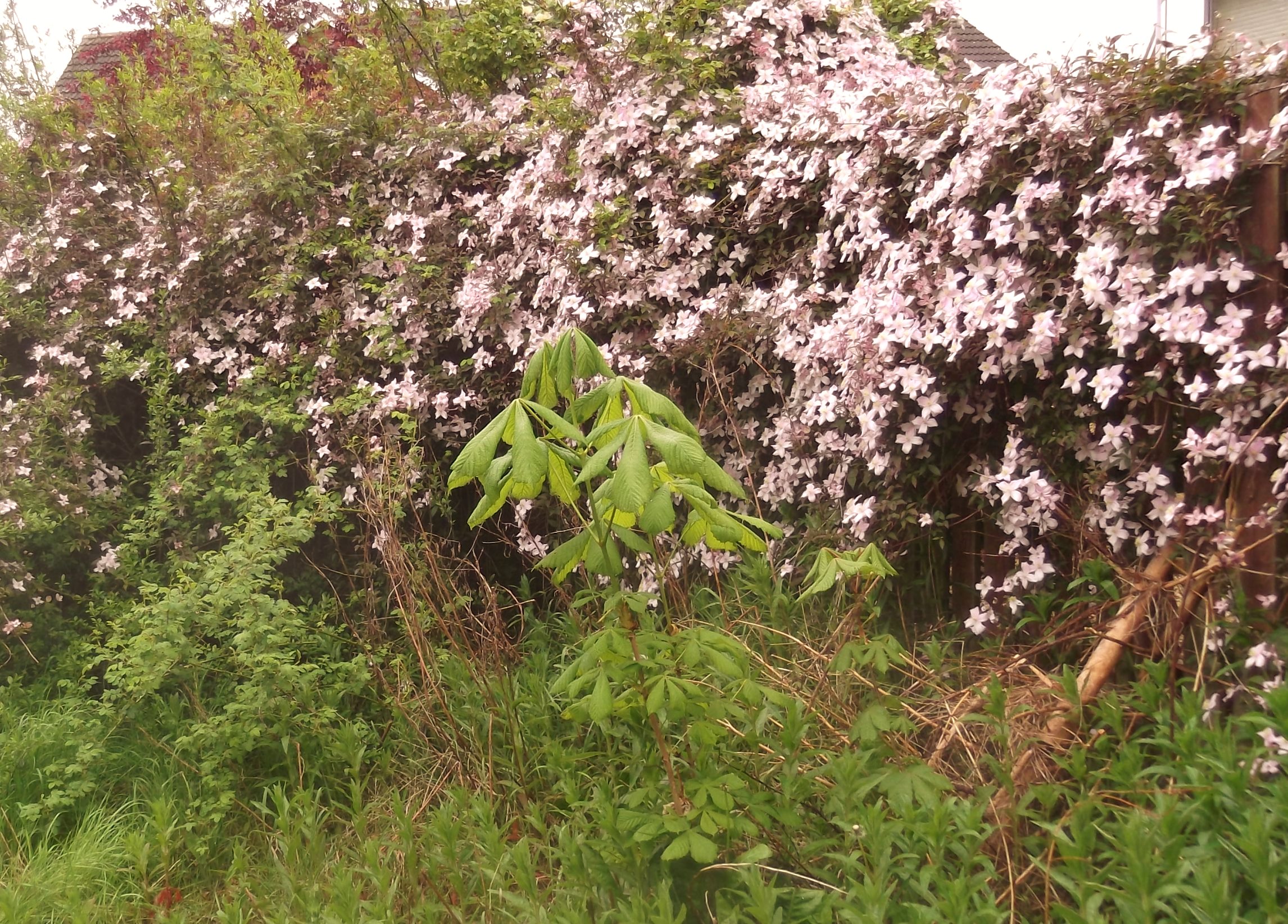 At the back of the bund you can also see examples of where MCT has been pollarding crack willows in the interests of future management and longer-term safety.  On other willows some attractive flowers may be seen in places. DSCF1193 DSCF1197 It’s inevitable that from time to time garden escapees will appear on the site. Where these are just poking through fences to search for the sun all we can do is stand back and admire, as for the beautiful clematis below.  They are good for local wild life. DSCF1194 Note though the young self-sown Chestnut tree.  It will probably be retained somewhere on the site, but its present position is far from ideal for the adjacent resident in the longer term. To the casual observer the image below may not be the most exciting on our web site!! However it shows that, after 9 days of our careful daily watering regime, our Kew “Grow Wild” seeds are starting to germinate on the patches of soil added by MCT after grassy tussock removal.  If not washed away by the monsoon that followed this bodes well for summer colour.