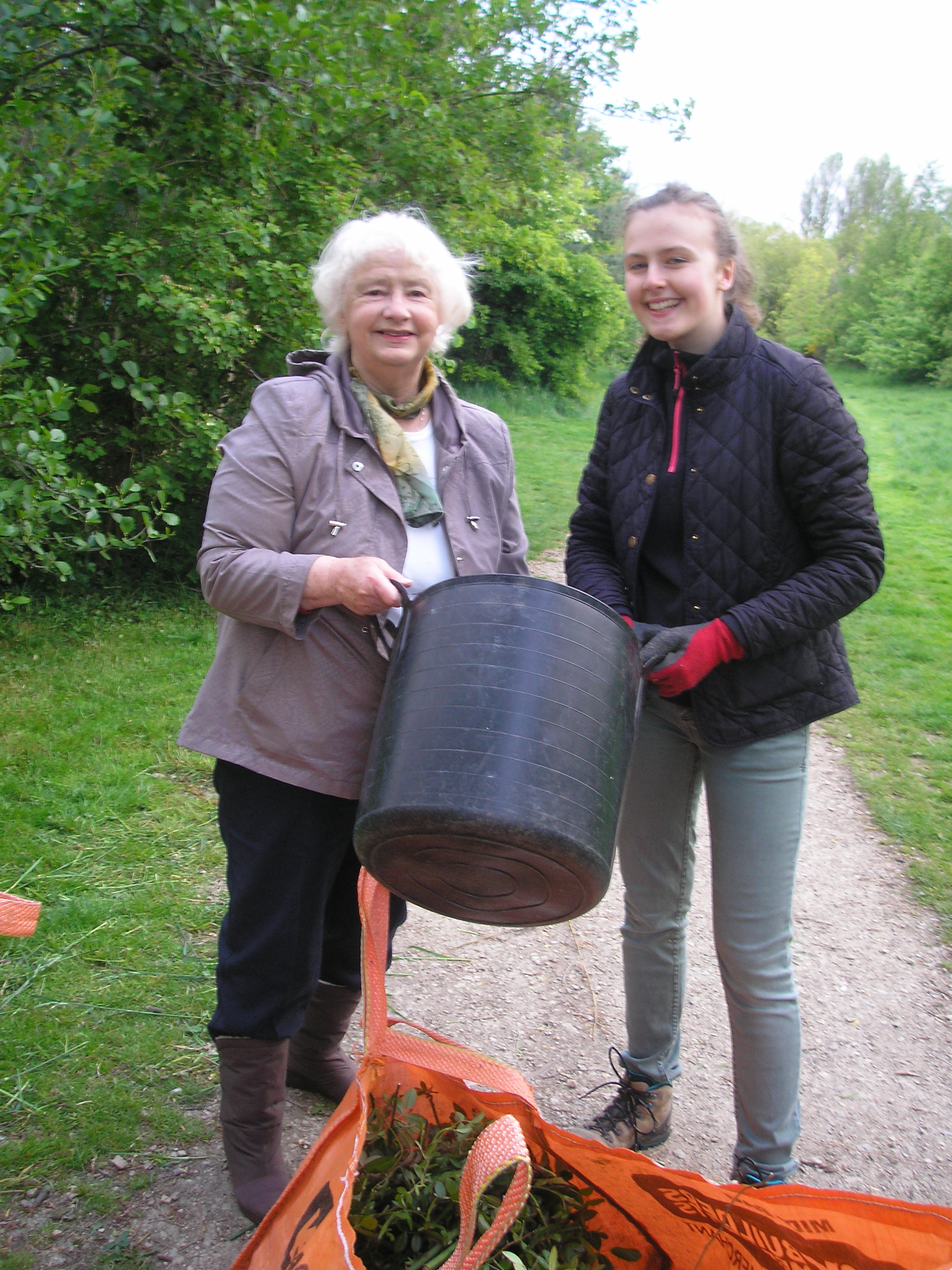 The warmish weather and occasional rain showers over preceding days meant that MCT volunteers, some of whom are shown in the photos below, were kept very busy improving the general appearance and growth conditions just North of Nelsons Lane at their Thursday evening volunteer session.  For once we managed to catch Pam Brown, our photographer and a loyal management volunteer, on the lens side of her camera while working with Harriet Thompson.