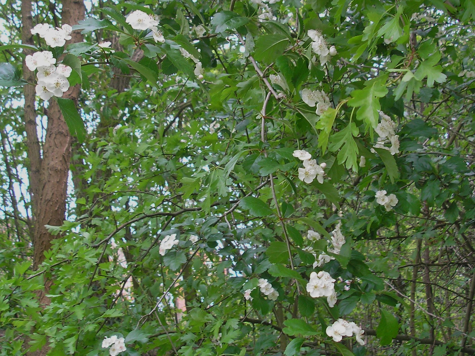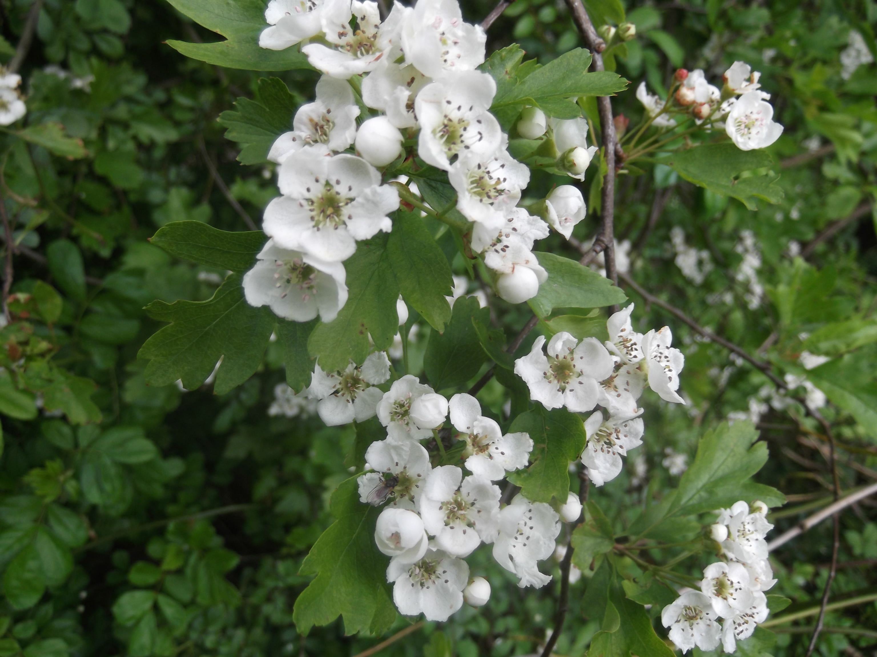 The blackthorns have turned from flower to leaf but two hawthorns were already blossoming on May 1st at the north end either side of the path.  One in particular has a slightly modified leaf shape, suggesting genetic variation compared to the other – there are small flower differences too.  Most are not yet flowering.  The smaller number of lobes on the foliage suggests that the one shown on the left below is either a midland hawthorn or a hybrid of midland and common hawthorn.