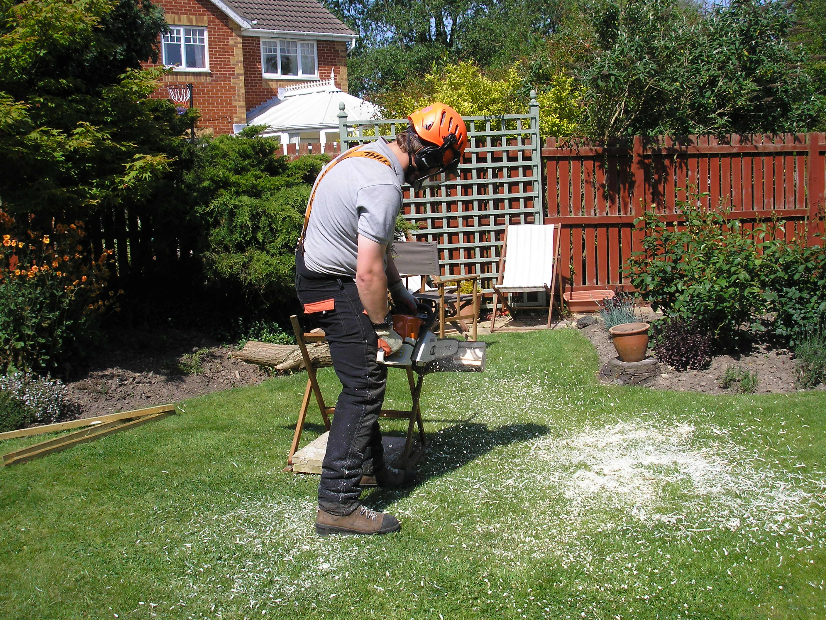 Although most of what you see of the work of MCT volunteers is what they do to woodland, the path and the meadow, they are also doing their best to encourage many forms of wildlife.  We now started making rustic bird nesting boxes from suitable waste timber from the site.  Pictures below show the sort of box Dave Moore is creating, working in an adjacent garden as we don’t use chain saws on the site.  You can see the MCT secretary is impressed by his handiwork!