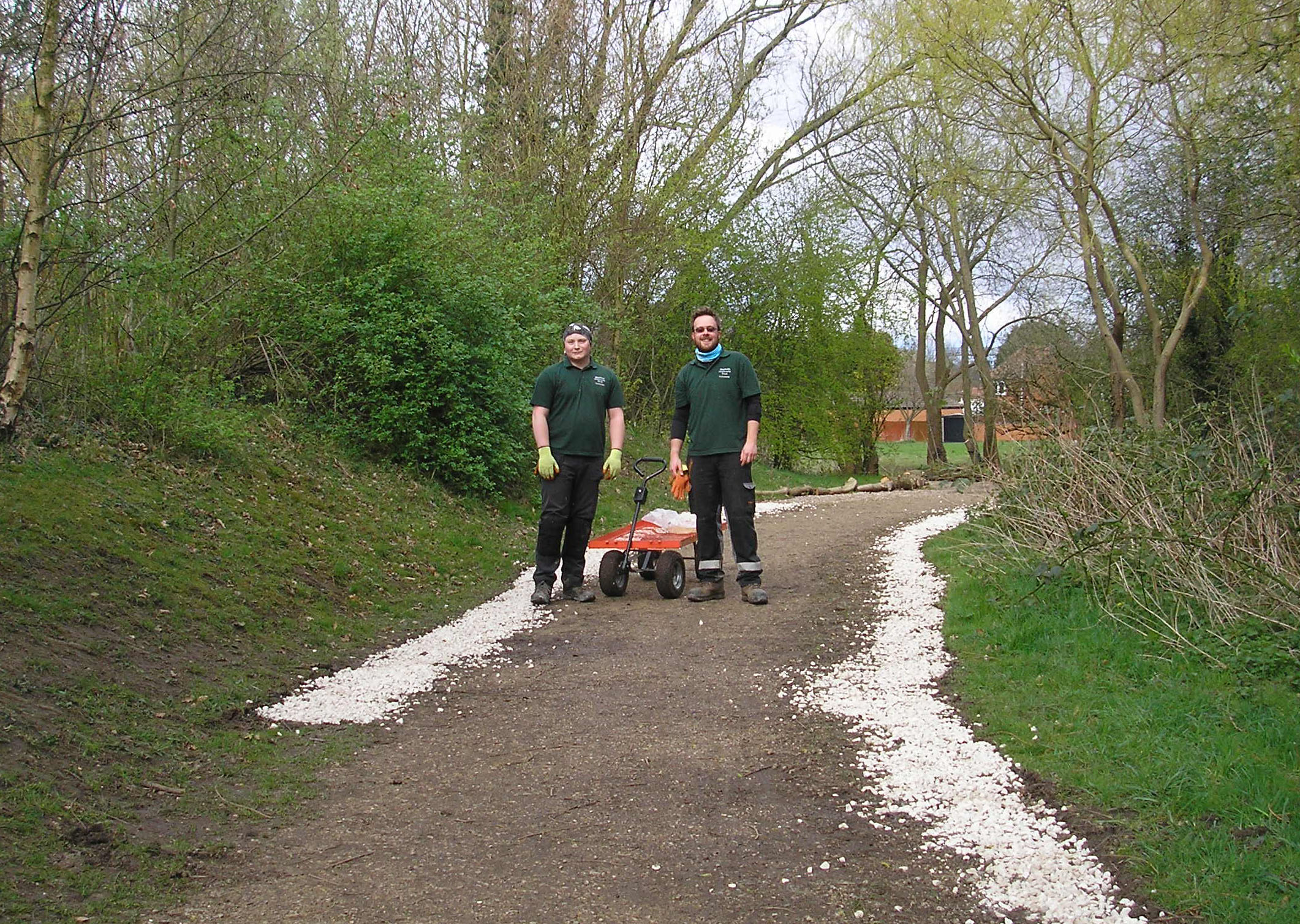 Fortunately it was dry in the morning on April 7th for Malcolm, Dave and Adam to use a tonne of Cotswold chips for path restoration. They’ll soon weather to the more normal path colour. Thanks to Pam Brown for the photo.