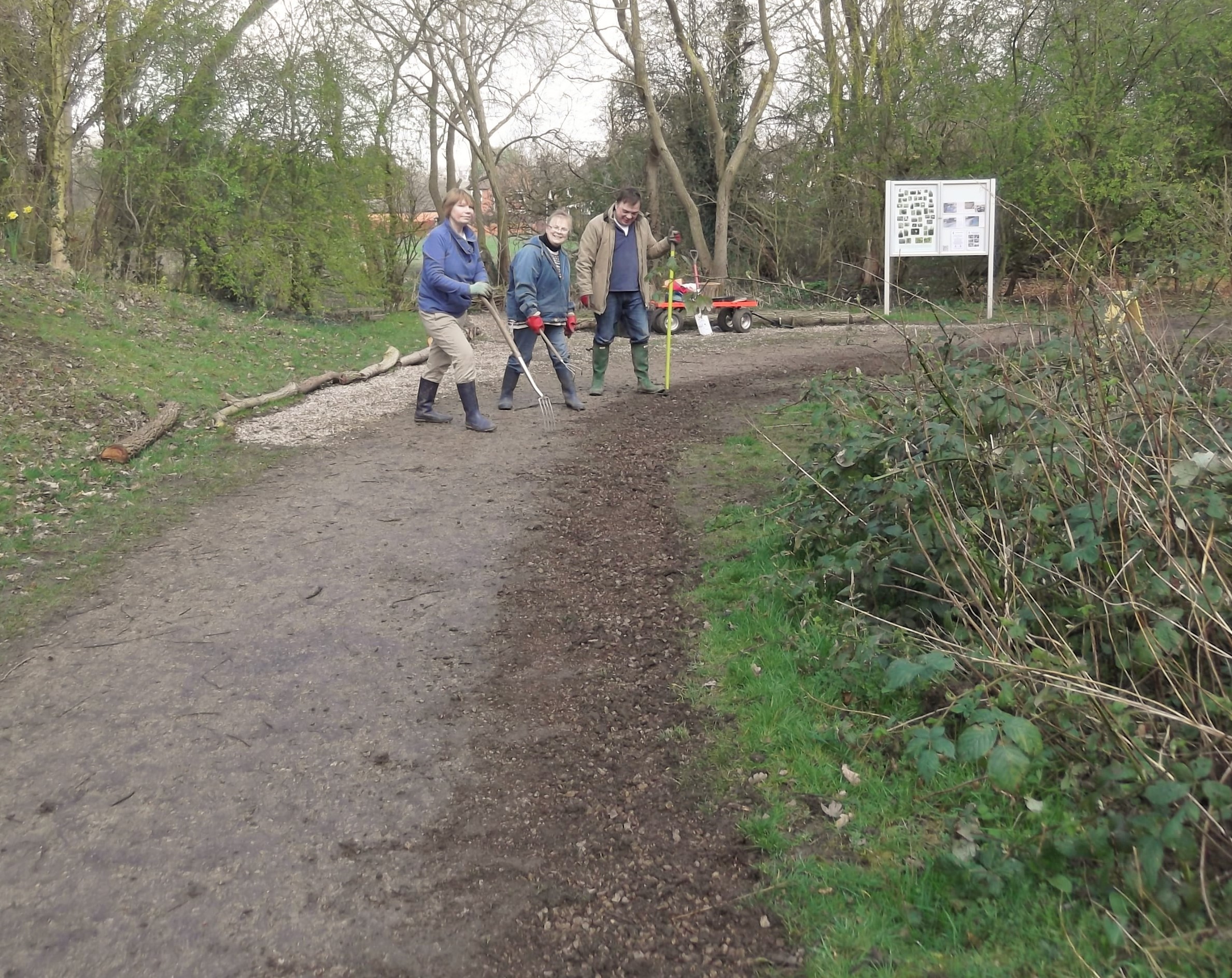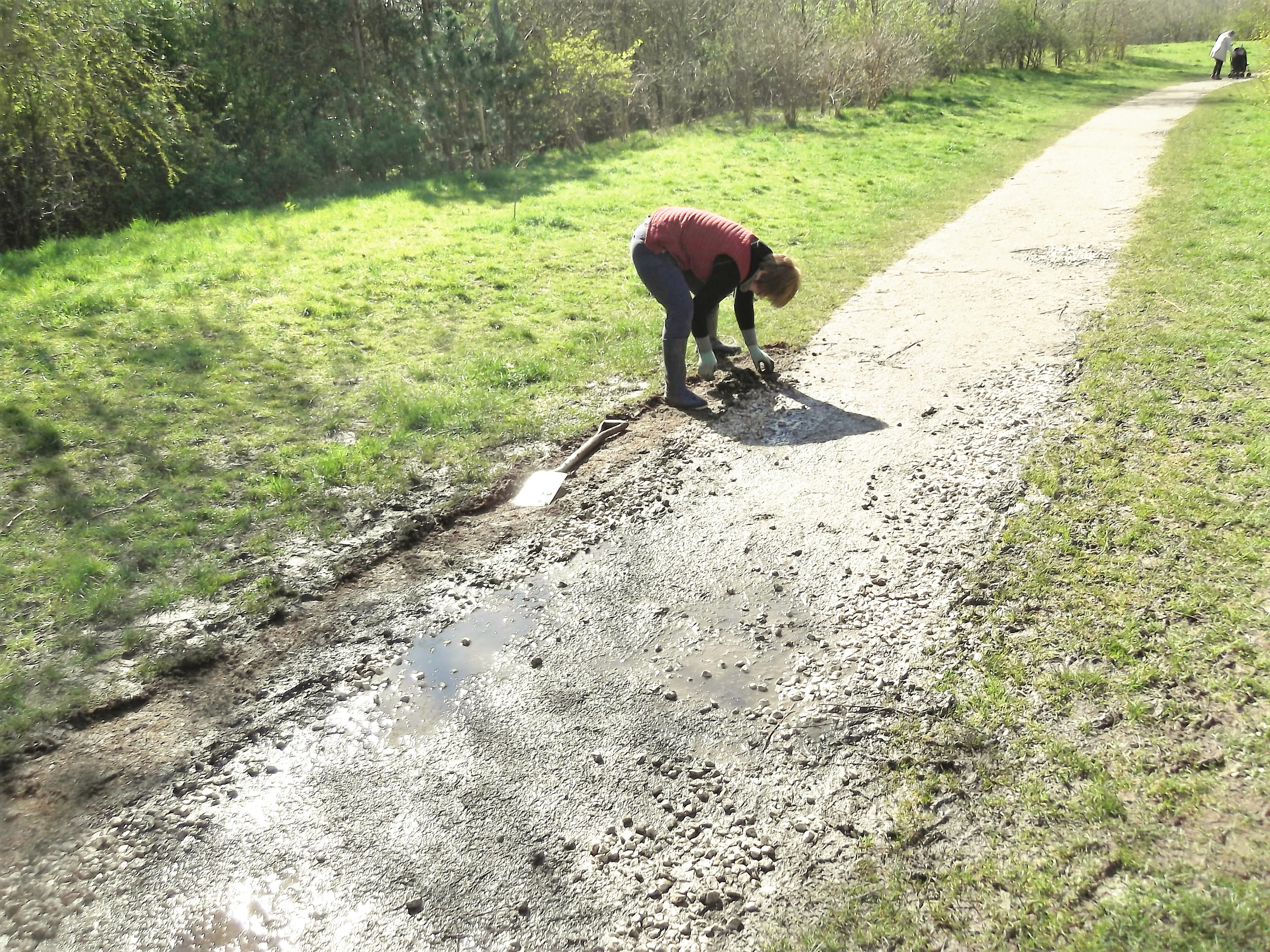 Lesley, Paul, Louise, Pam and Margaret enjoyed a sunny period on Sunday April 3rd to do several more metres of path restoration close to the Little Hob Moor end, prior to adding more Cotswold chips (due the following Thursday). They scraped away grass and mud overlapping the path that had been churned up by cyclists, and replaced some of the gravel after sieving. Pam and Louise also cut up willow offcuts from the previous Thursday volunteers session.