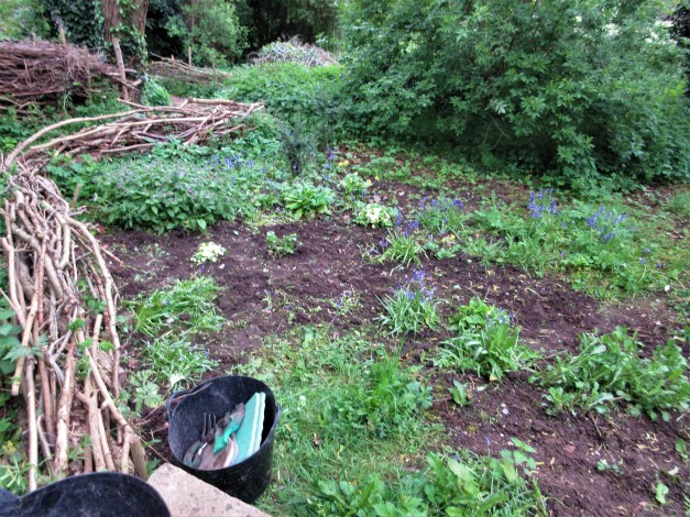 The main area of English bluebells is starting to look really attractive after all our efforts over the years. The photo shows what part of it looked like after another hour of selectively removing velcro plant, ground elder, nettles and some docks and buttercups on Sunday morning on the 28th April. Stll more to do though.