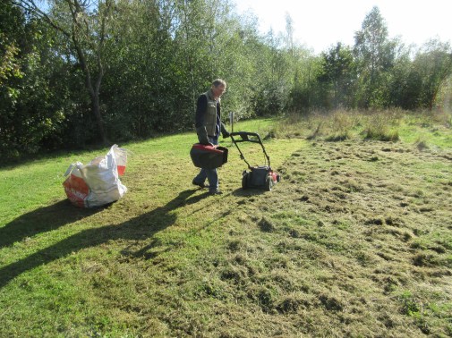 This photo of Mike Ridealgh on October18th shows effects of the 3-step process, strimming to reduce clumps, raking and then mowing at 4 cm. We’re always on the lookout to protect frogs and toads!