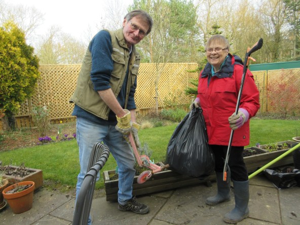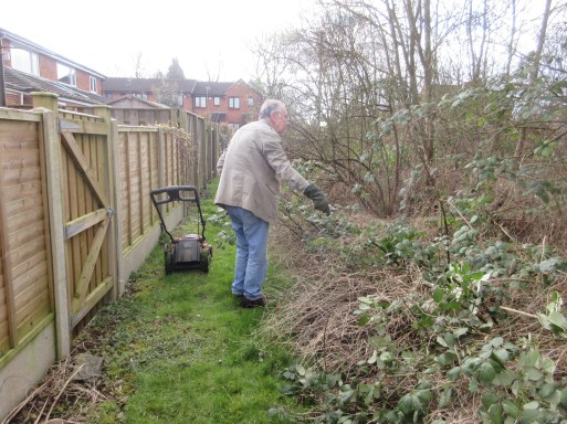 A pleasant day on Sunday March 8th for work behind Hobmoor Terrace houses. We also spread 6 bags of gravel on muddy parts of the path behind Goodwood Grove houses.