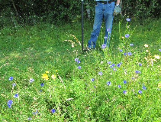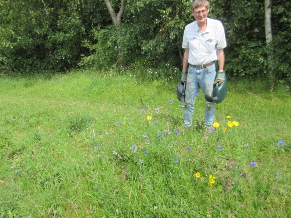 Great to have Paul and Lesley Abbott back on Saturday 20th June helping Malcolm trim back the ivy creeping over the path edge. Mike was back again on Wednesday 24th to help tidy up a pear tree behind Hob Moor Terrace, damaged in bad weather a couple of weeks earlier. Steve had also done a lot to tidy that area. Corn flowers and corn marigolds were doing well.