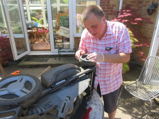 Paul came out on June 25th to help repair the damaged battery mower. He realized that a hair dryer was the best way to soften the replacement plastic wheel support by temporarily softening the self-locking lugs that held the axle in position.