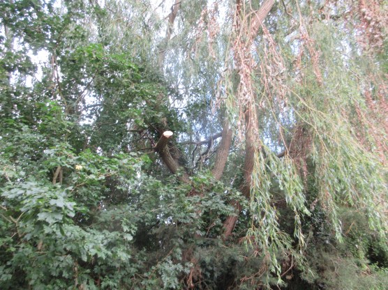 A large branch of Crack willow was left hanging insecurely after recent wind.  As soon as MCT heard Malcolm went out (on July 30th) and cut down the hanging branch in several stages.  Off cuts were dragged to the MCT composting area to be safely cut up later.