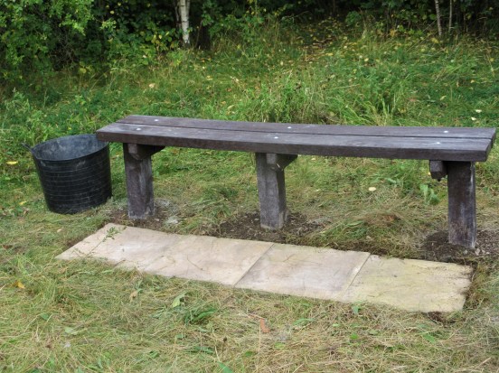 As the grass gets very worn in front of the other 2 benches that MCT has installed on Mayfields North, on August 17th we inserted 4 paving slabs in front of the new bench.  We put a weed barrier under them after stripping away the turf to reduce weeds in the gaps and made them flush with the surface for safety reasons..