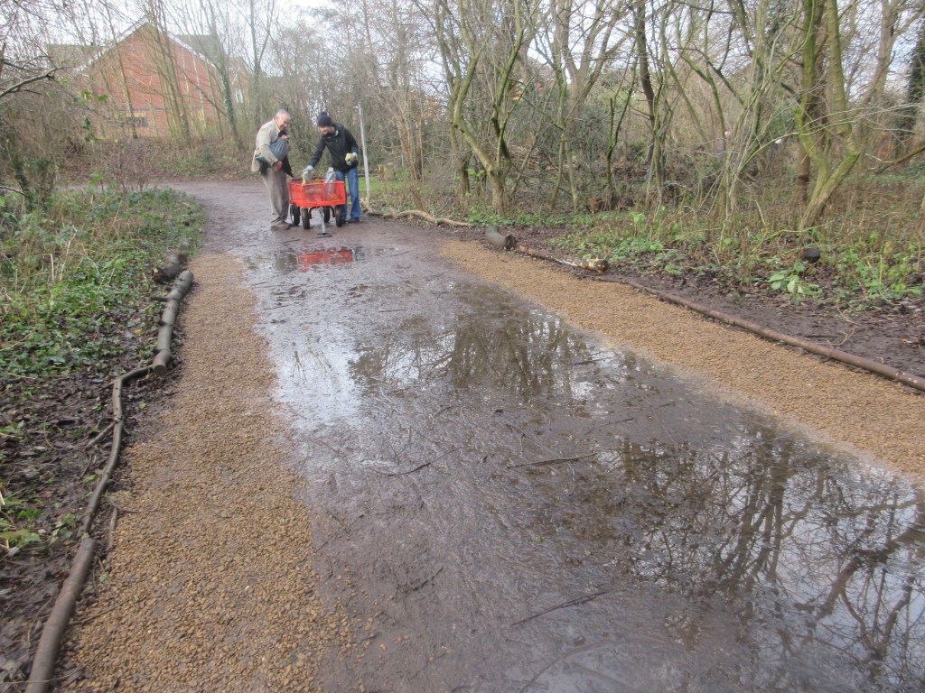 Kathryn and Malcolm were back out on Mayfields on January 8th, assessing priority jobs for the volunteers for the next few months. Top of their list was adding pea gravel to both sides of the main path at the Little Hob Moor end to provide a drier walking area with safe social distancing. They were back out with Louise on Sunday 9th to add 7 bags of gravel to each side of the path.