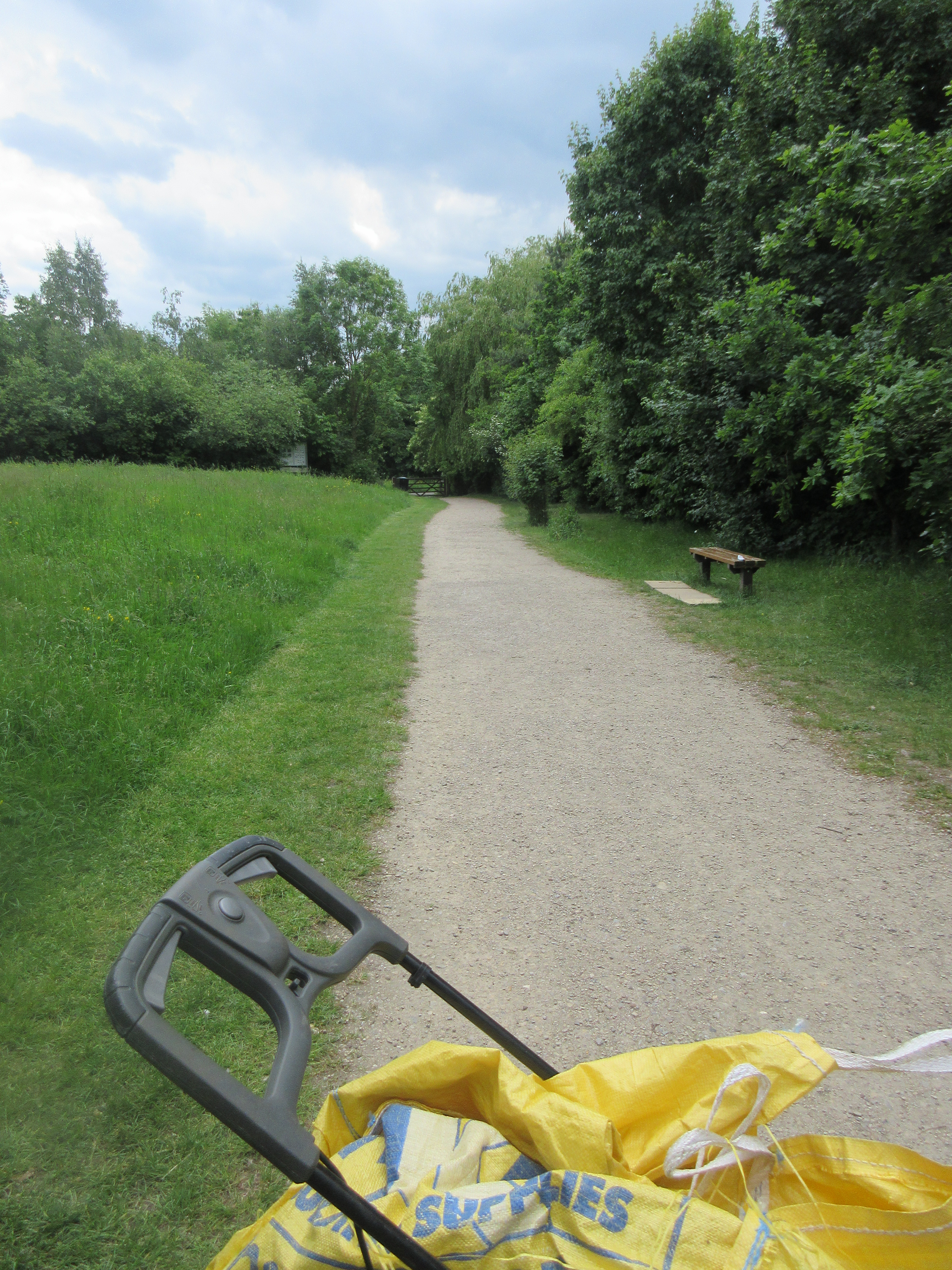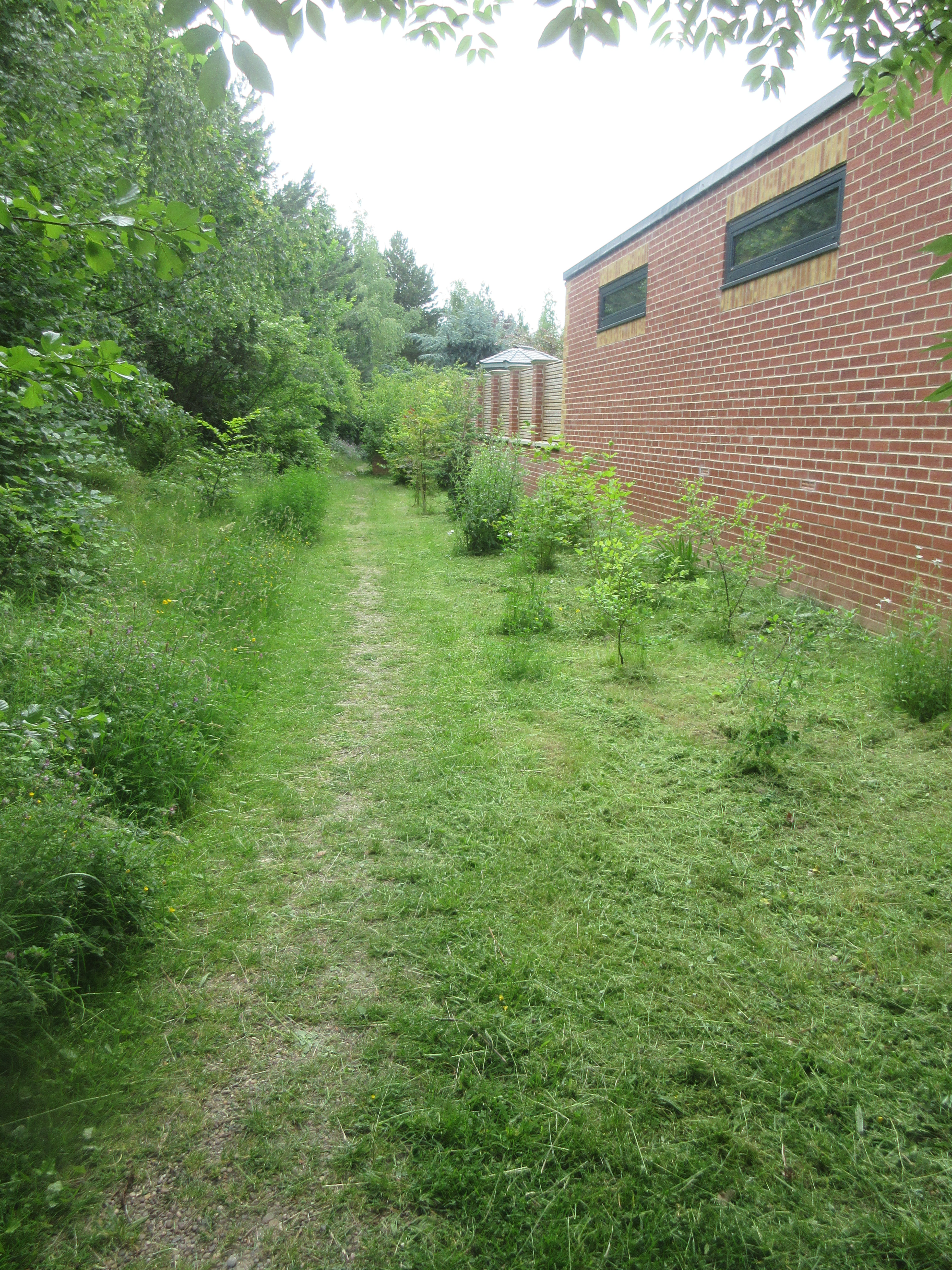 Still no rain on Saturday morning (June 25), but at least it was cool enough in the shade to spend 2 pleasant hours reducing the velcro plants, docks, nettles, brambles and excess buttercups that were starting to starve some of our recently planted shrubs of water and light.