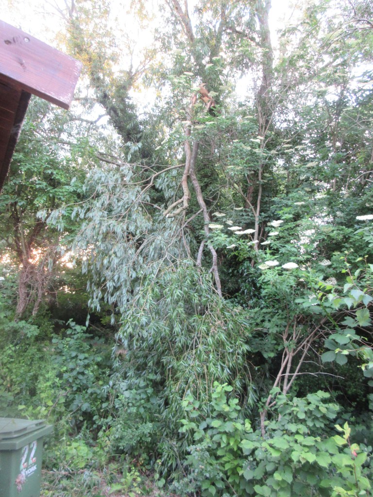 Kathryn noticed a pair of large willow branches that had broken off of a crack willow at the N end of the site, overhanging an adjacent property.. She later came out with Mark and Louise to help reduce the overhang to a safer level. We’ll try to cut the remainder down later in the week.