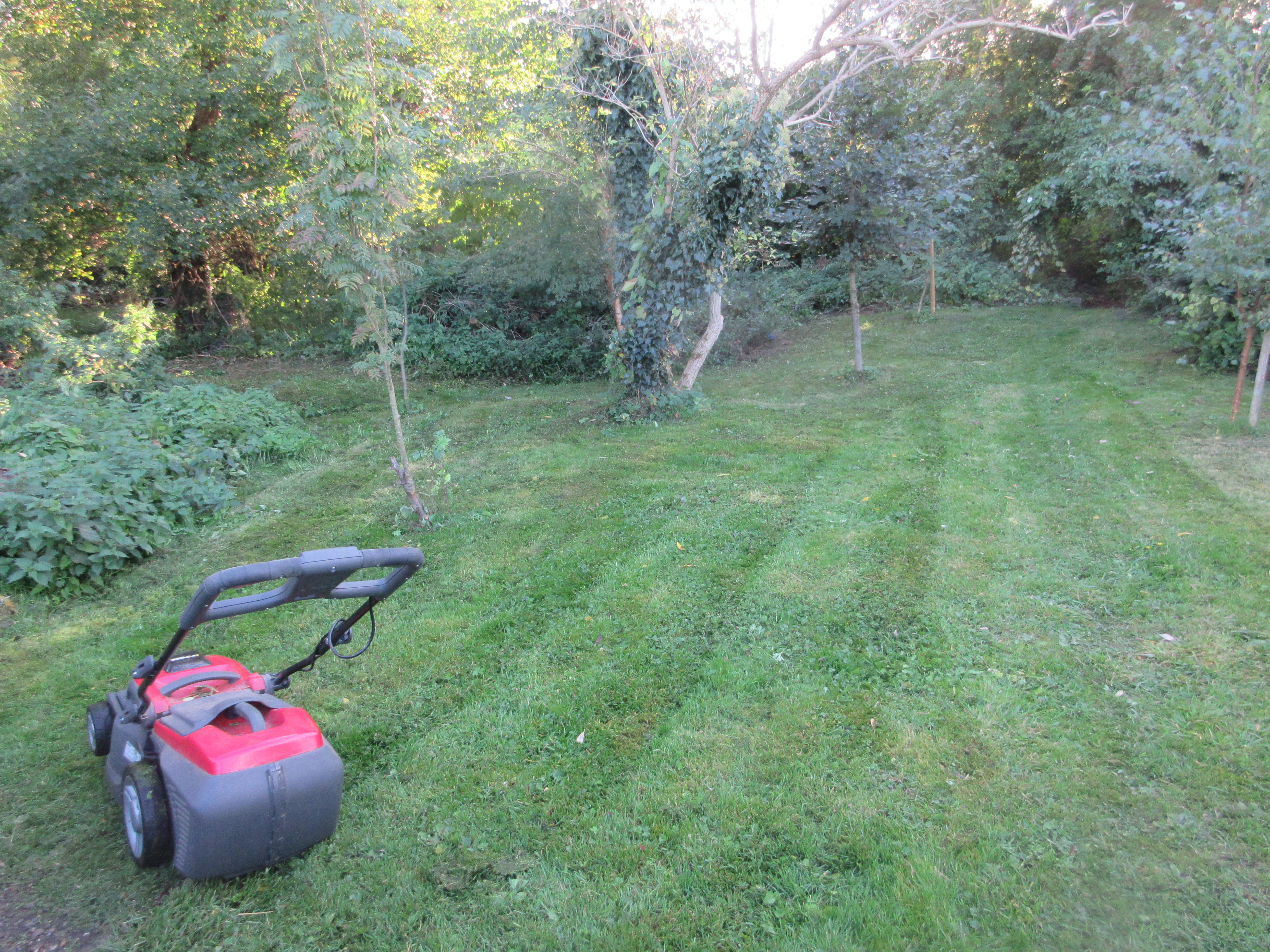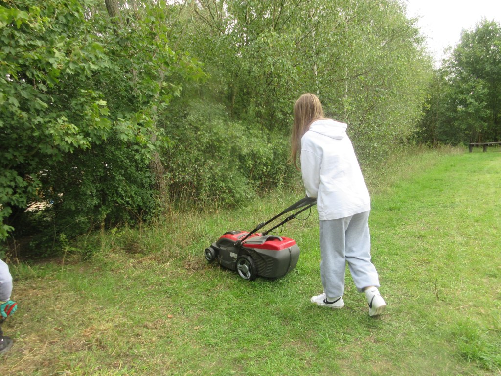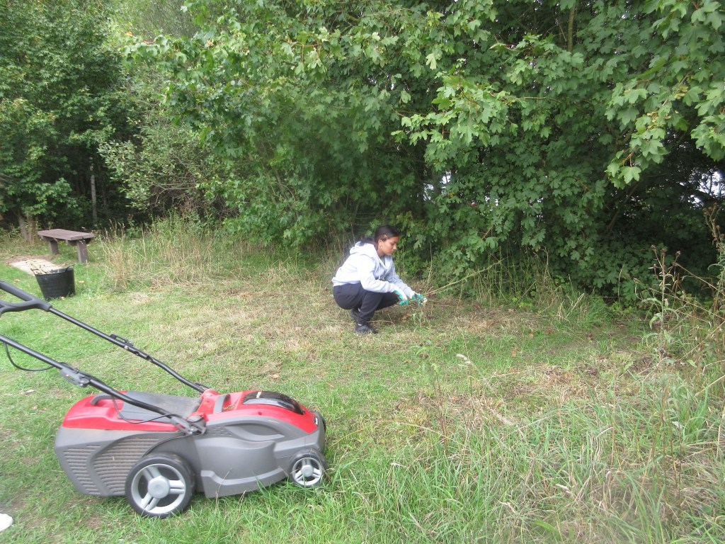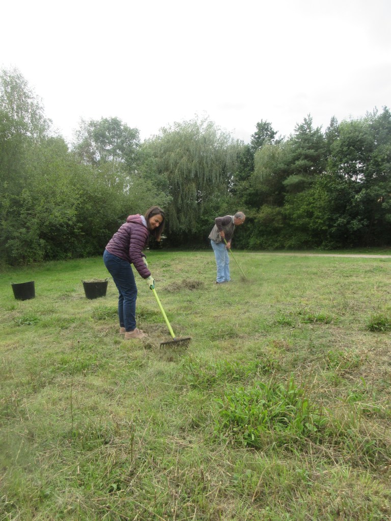 By September 18th we had finished trimming the dead vegetation on the meadow (via a series of 1 or 2-hour strimming and raking sessions by Malcolm, Mike and Kathryn). Sabrina and her friend Joey joined Mariella, Alek, Malcolm and Louise on the 18th to help mow around the outside of the meadow and collect up all the cut vegetation for composting.
