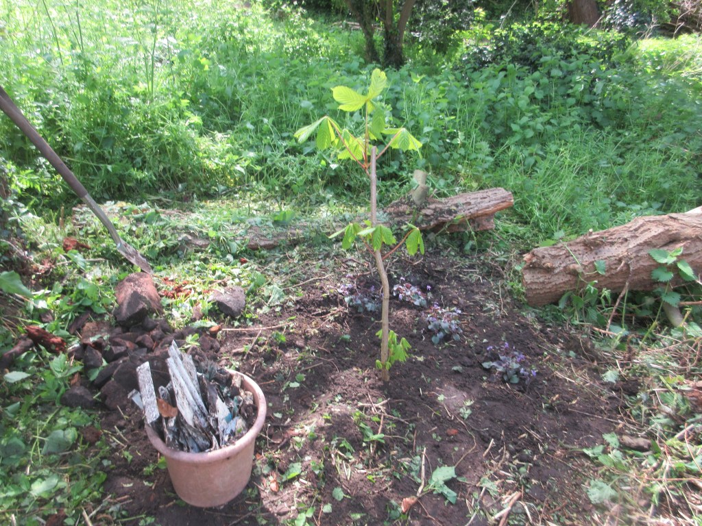 Great weather on May 2nd for Mike and Malcolm to plant out a replacement tree donated by Anne Partridge last year. We planted 4 Violas in the surrounding soil as they should do well here in the dappled shade if we control competition for a while.