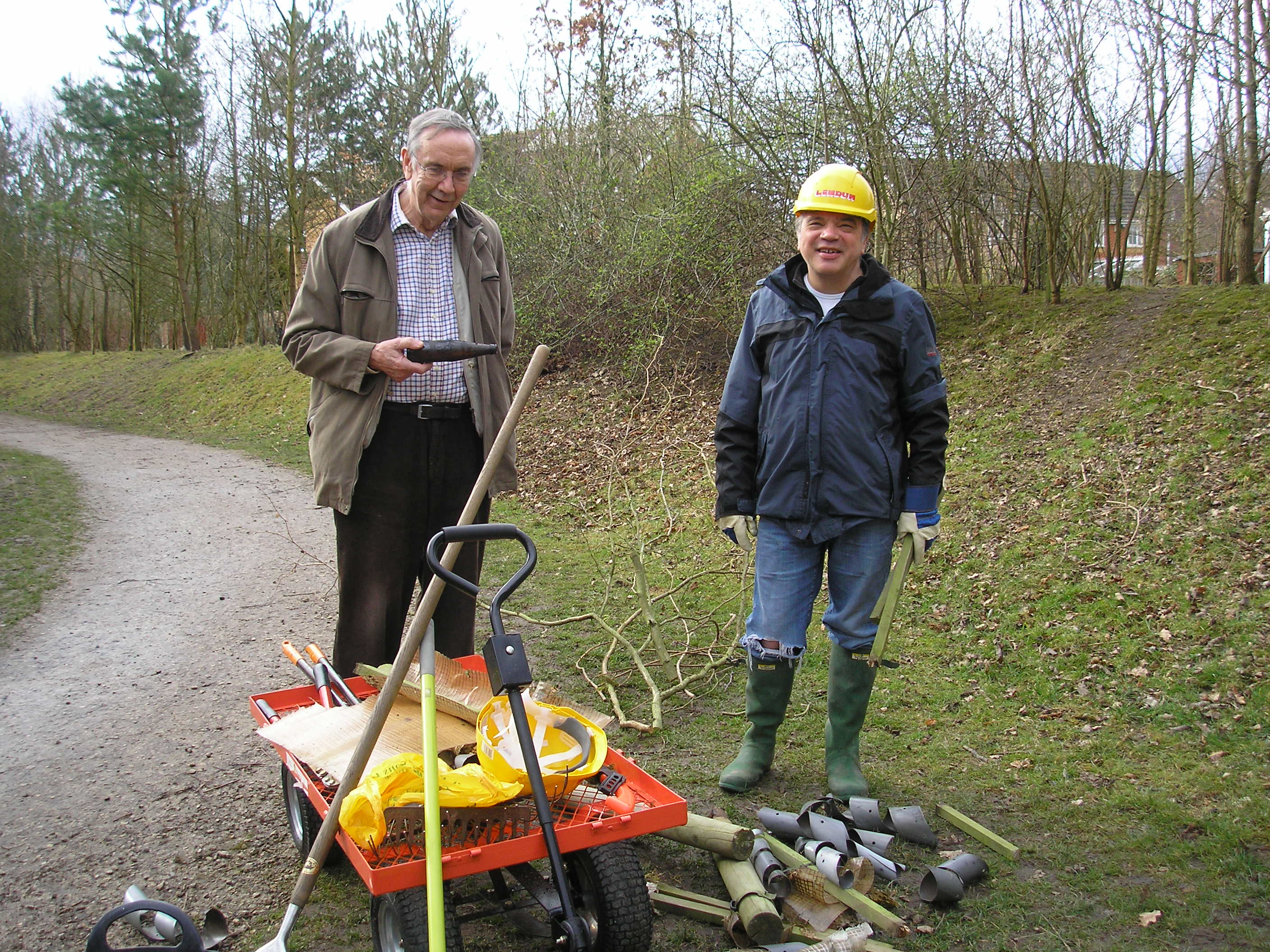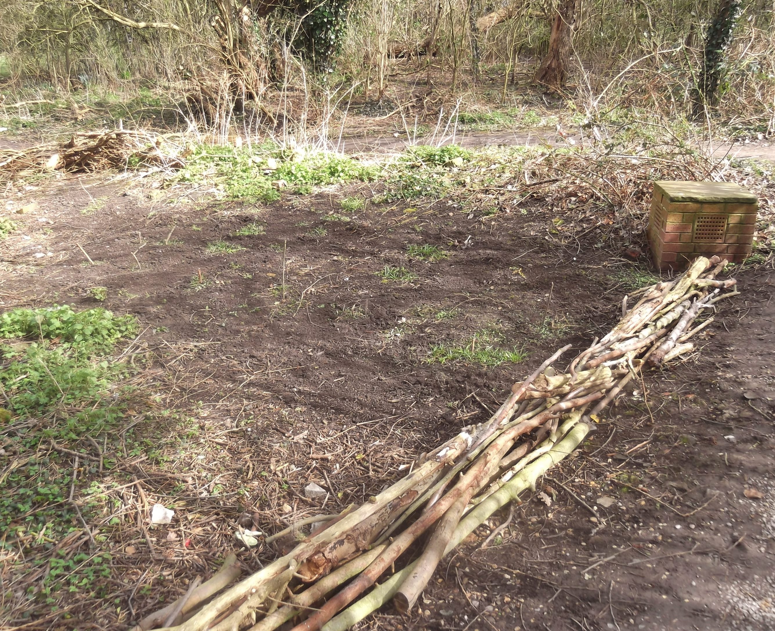 An alternative way of providing nesting habitats is the creation of dead-hedges. Mike, Dave, Adam and Malcolm started creating a south-facing dead hedge on 28th January from waste materials on the site. The hedge will also partially screen off the composting area.