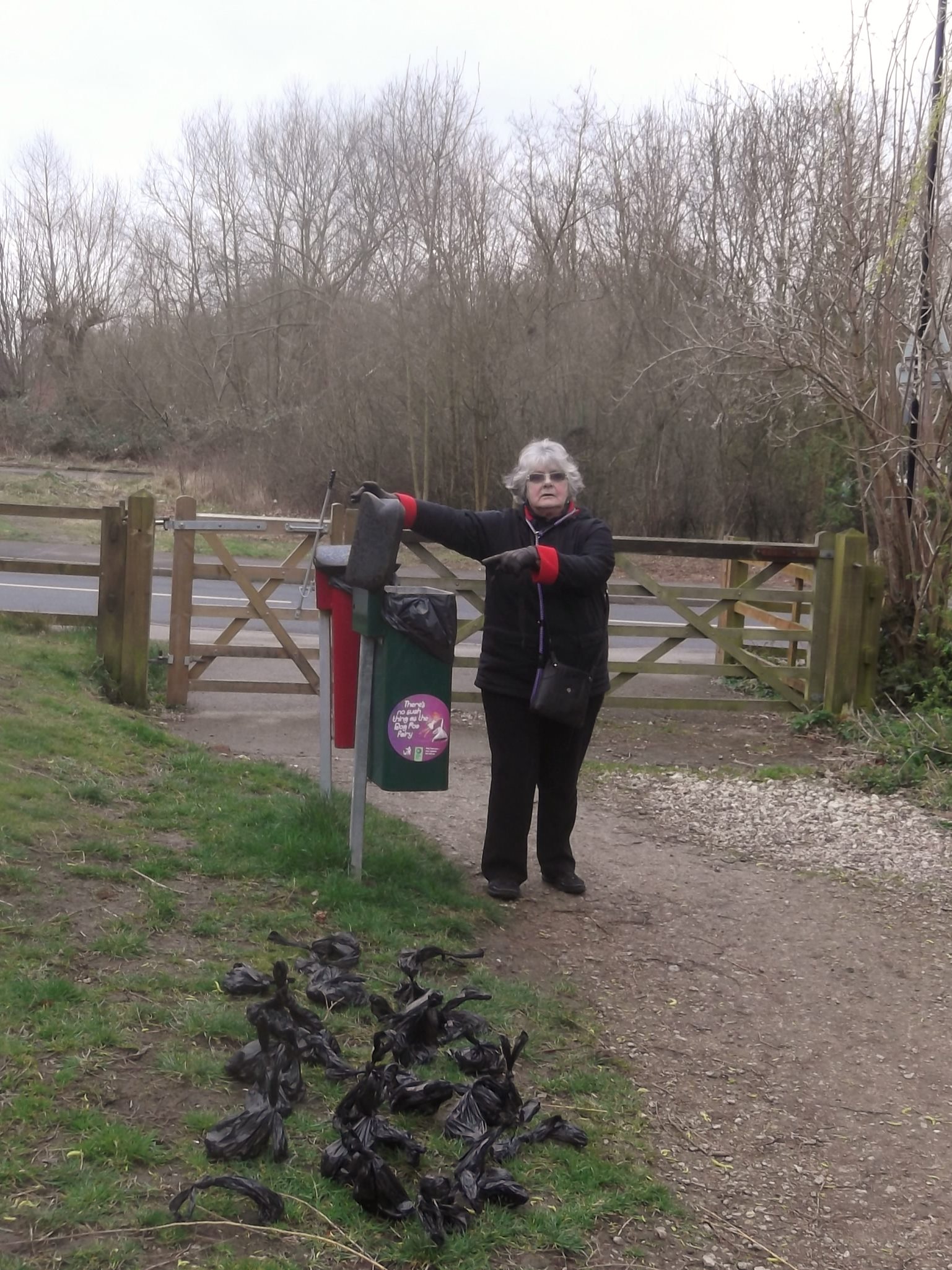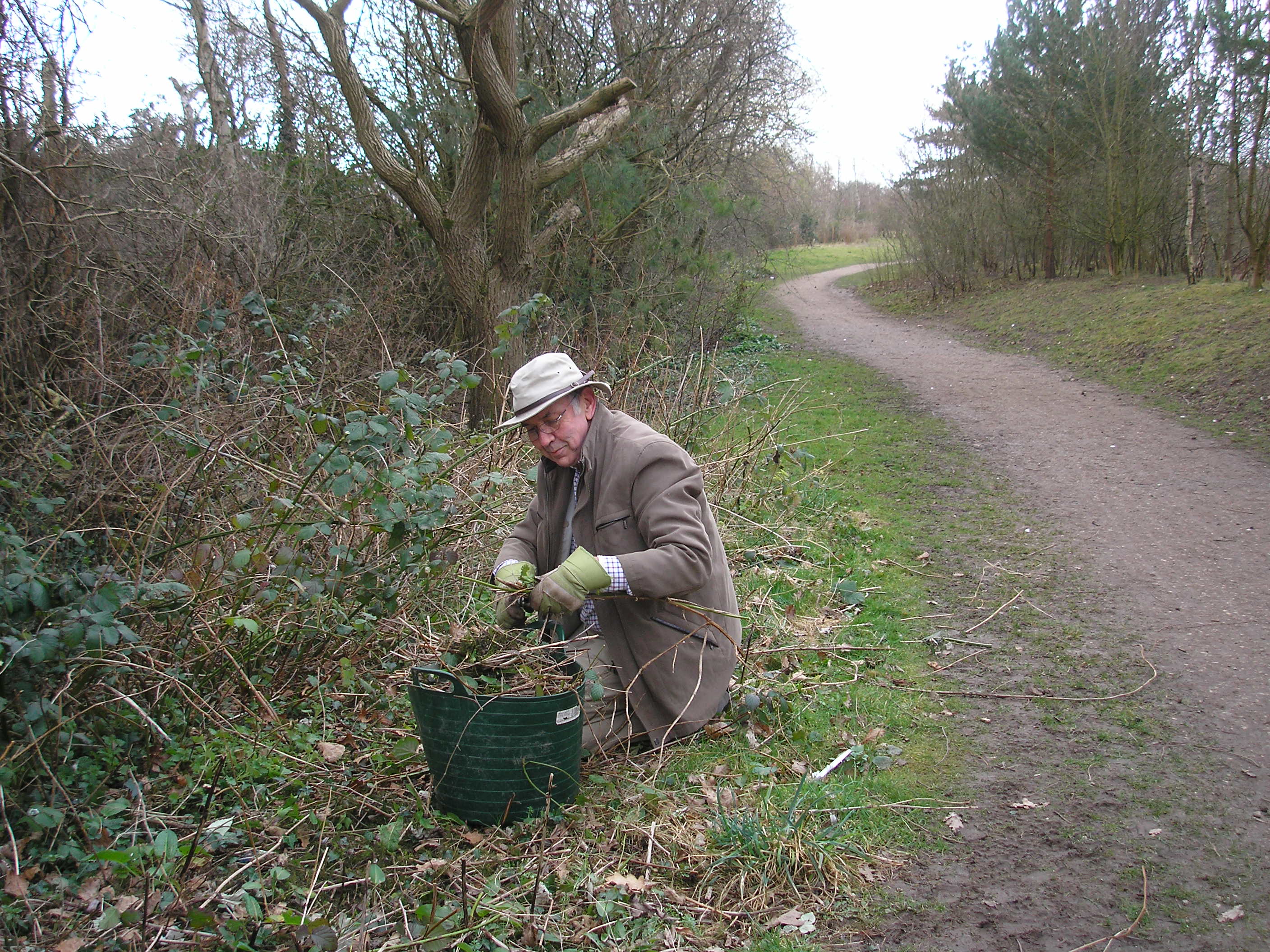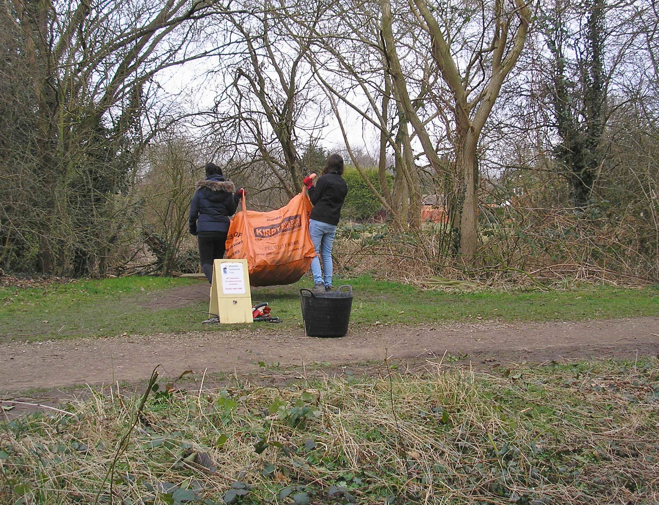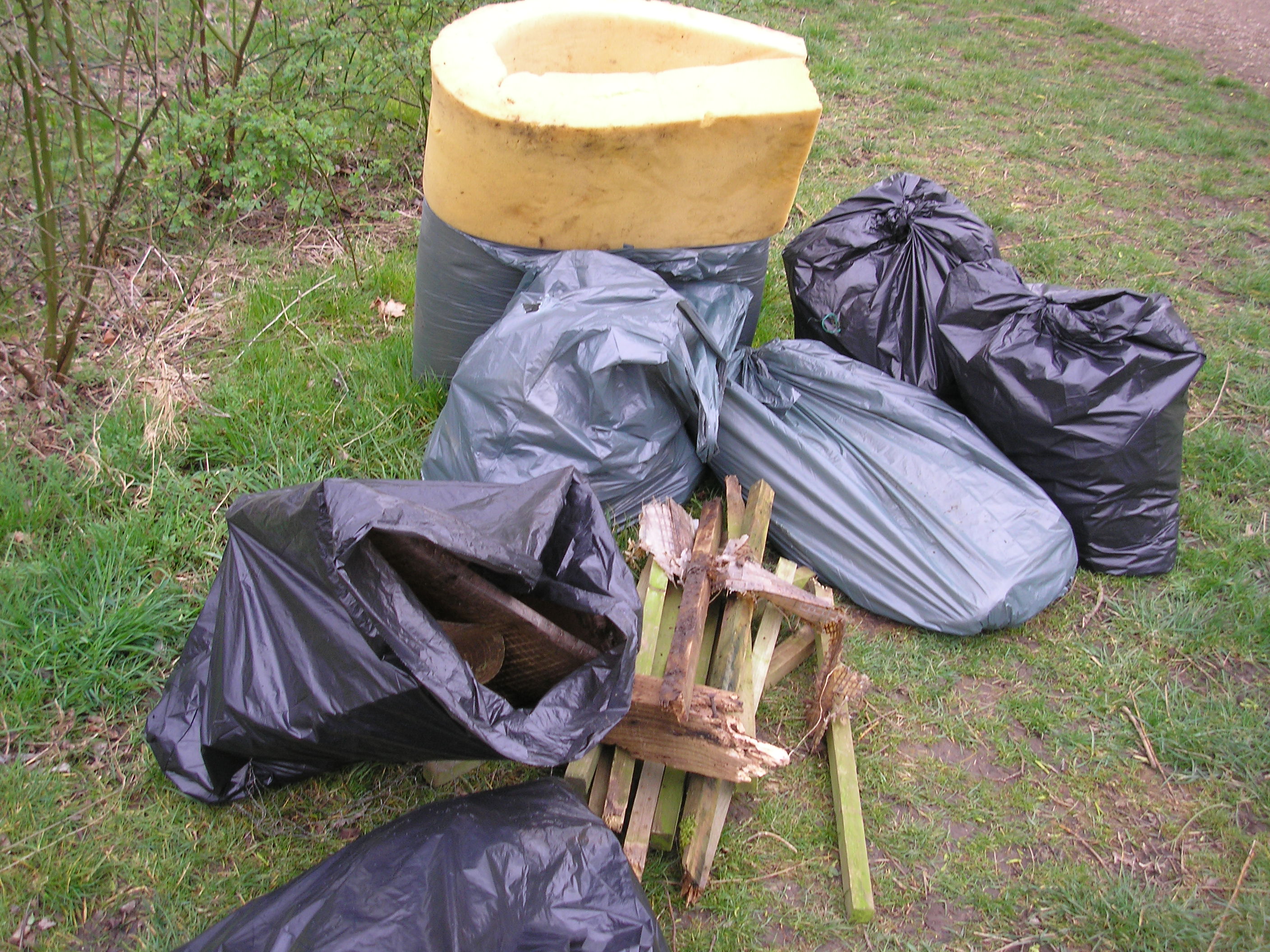 A break in the weather on the morning of Sunday 10th January allowed Louise, Pam and Malcolm to spend an hour gathering up litter and disposing of it properly. Cans and bottles in (and round) the playground included a broken vodka bottle that needed careful collection for obvious reasons. Almost as anti-social was the pile of very thorny garden prunings from a Pyracantha dumped beside the rear path; we cut them up, bagged them (as below) and put the material on the compost heap.