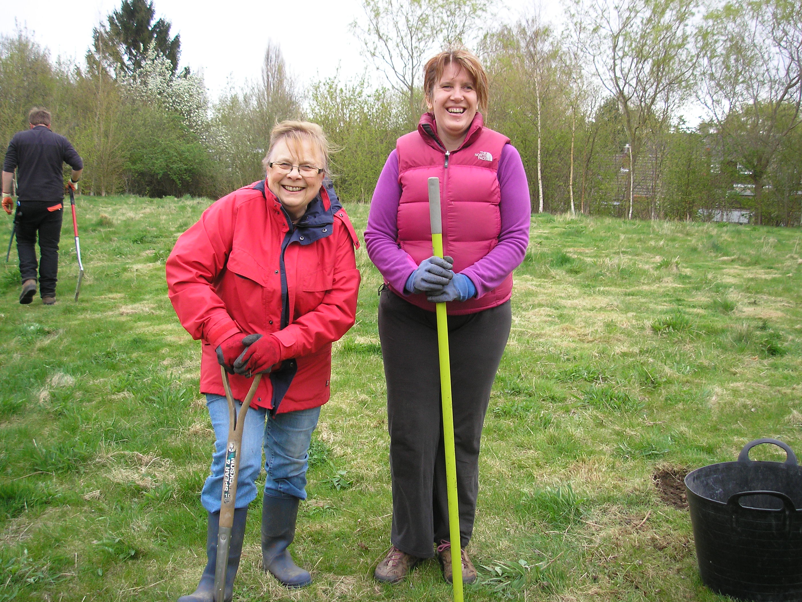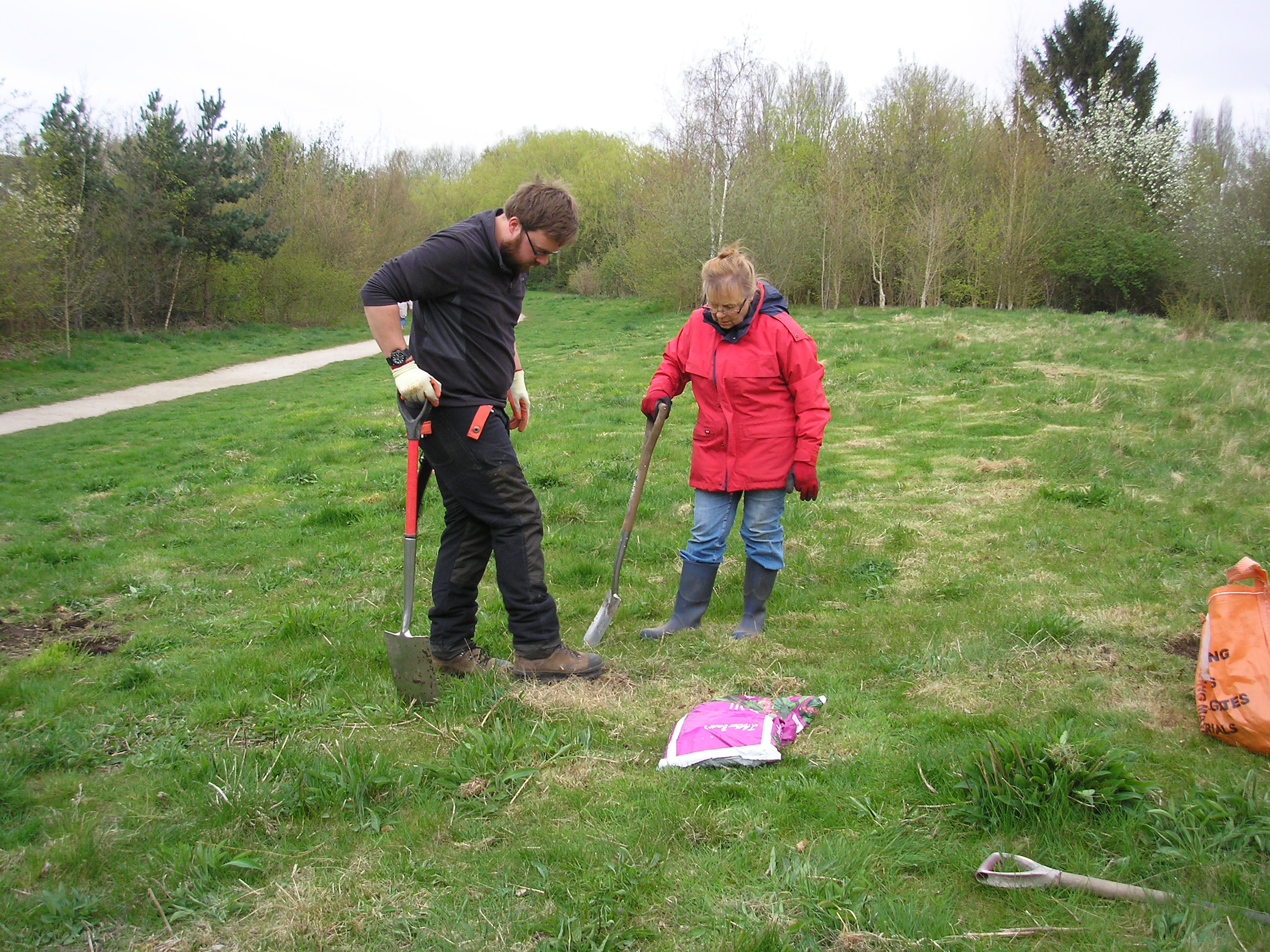 After a meeting of a group of Trustees and Volunteers on Valentine’s day we decided where to install the second bench funded by the Dringhouses & Woodthorpe Ward Committee. Pam’s photo (below) shows Malcolm, Paul and Adam hard at work digging out half a metre depth of soil to house the concreted-in bench legs. Meanwhile Jacqui, Lee, Louise and Lesley were working on the dead hedge at the north end of the site before coming to help with the installation. We were delighted to welcome Lee to our volunteer session. You can see a short video of how the installation is done on our Facebook page.